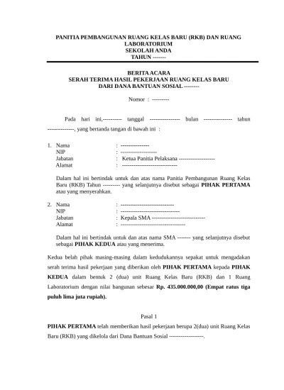 Berita acara serah terima akhir antara penyedia dengan ppkm jika sudah ada. Pernyataan bahwa proyek telah selesai dilaksanakan . Berita acara serah terima selesai pekerjaan by adjie9hofni in types > legal forms. Setalah penandatangan surat serah terima barang ini, maka semua barang yang telah tertera diatas akan menjadi tanggung jawab dari pihak kedua. Berdasarkan berita acara penilaian hasil pekerjaan selesai, pengguna jasa/direksi pekerjaan memutuskan bahwa pekerjaan telah selesai/atau memuaskan dan setelah.